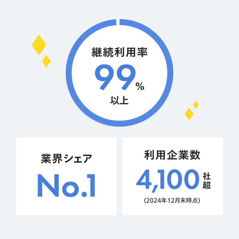 「カオナビ」は4,000社以上(※1)に導入され、タレントマネジメントシステム市場で8年連続シェアNo.1(※2)を獲得。継続利用率は99%以上(※3)を維持しており、機能の使いやすさと顧客満足度の高さを強みとしています。