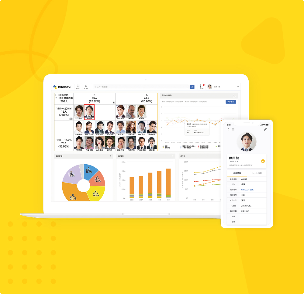 『カオナビ』は、人事業務の効率化から戦略人事の実現まで、幅広い目的で利用できるタレントマネジメントシステムです。