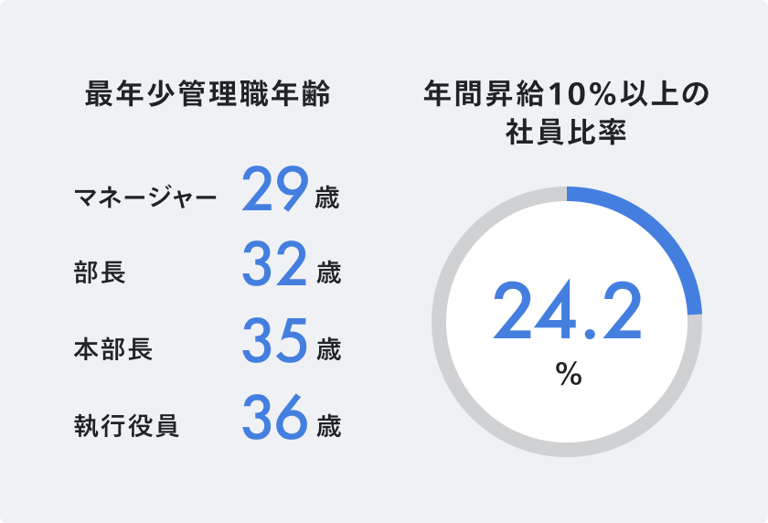 年齢や在籍年数に関係なく、アウトカム、意欲次第でスピード感のある昇格も可能です。